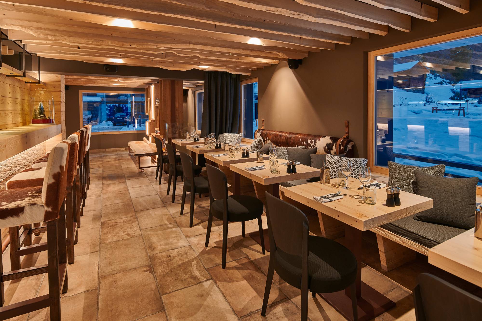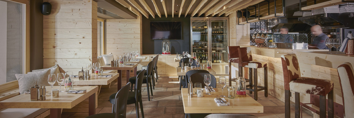 Le Chalet propose un intérieur chaleureux en bois brut, des couleurs chaudes et un mobilier aux tissus typiques. La convivialité de la cuisine ouverte fait du restaurant un lieu de partage et de gourmandise.